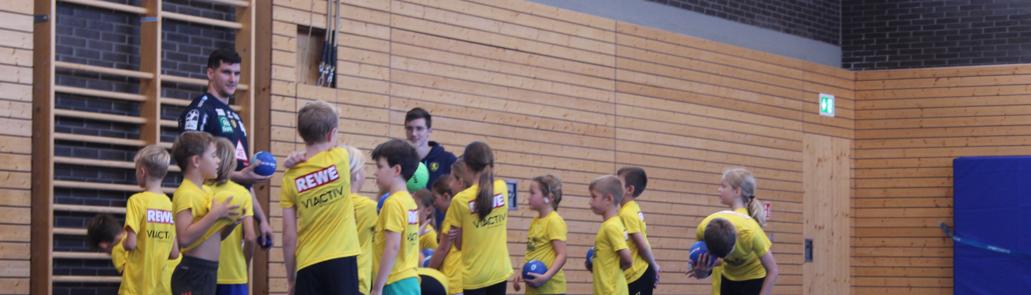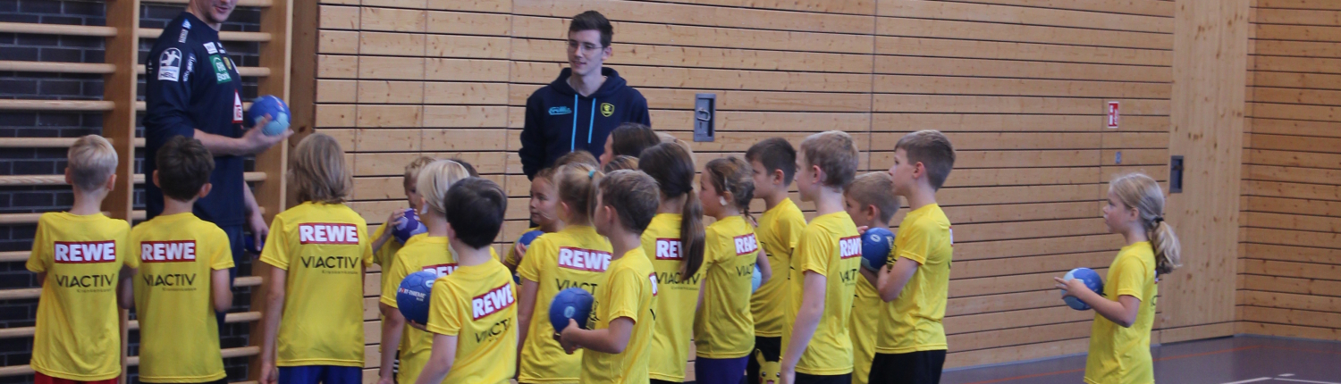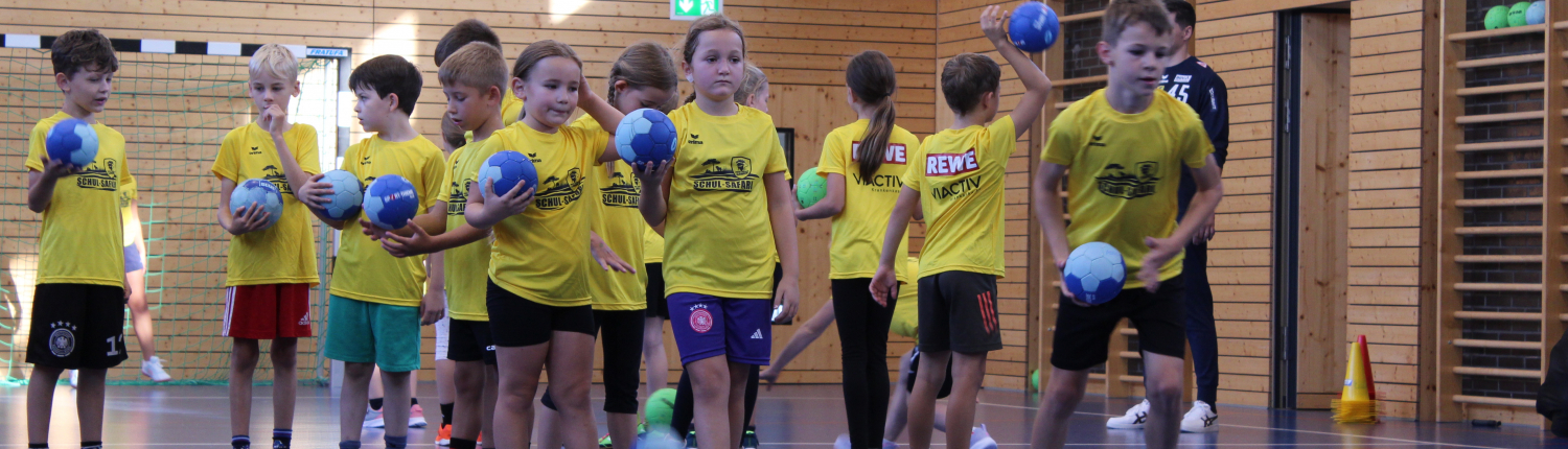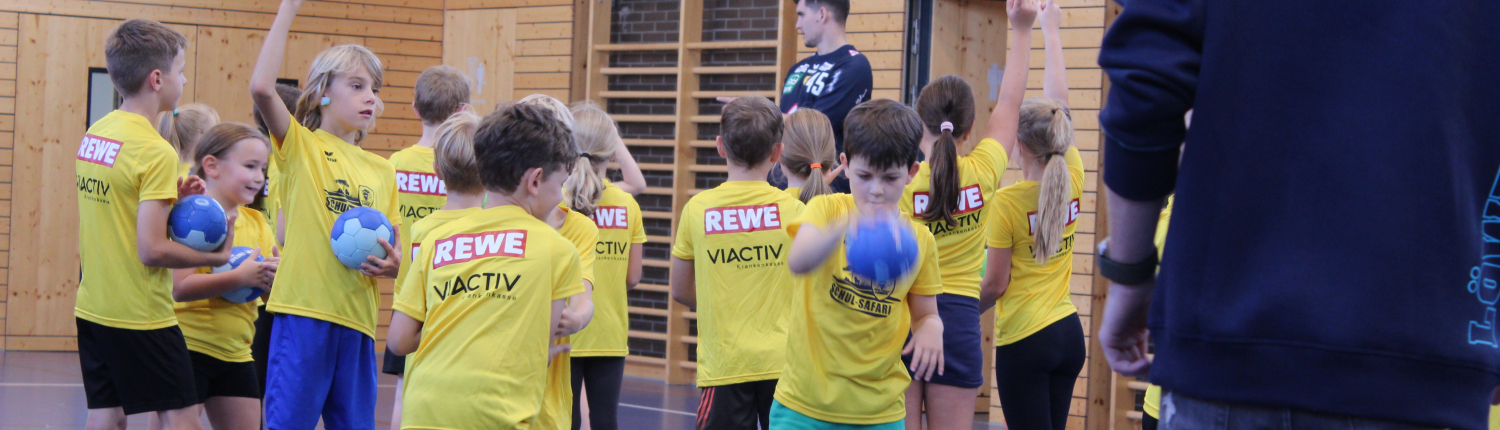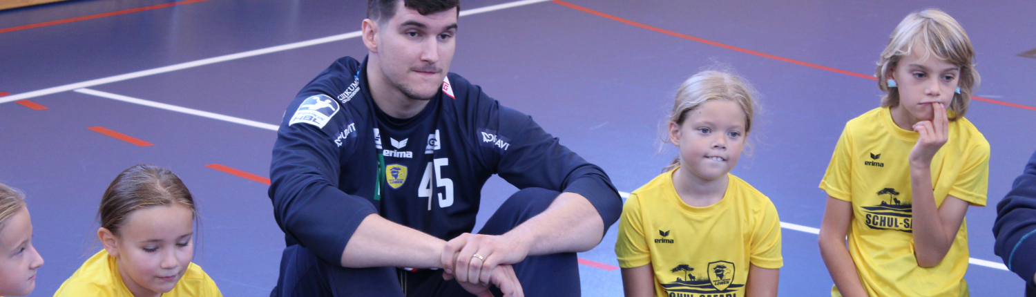 Im Rahmen der Schulsafari kamen die Kinder in den Genuss eines professionell angeleiteten Handballtrainings mit dem kroatischen Nationalspieler und Weltklasserückraumspieler Halil Jaganjac und Junior Marketing Manager Luca Altemeier.