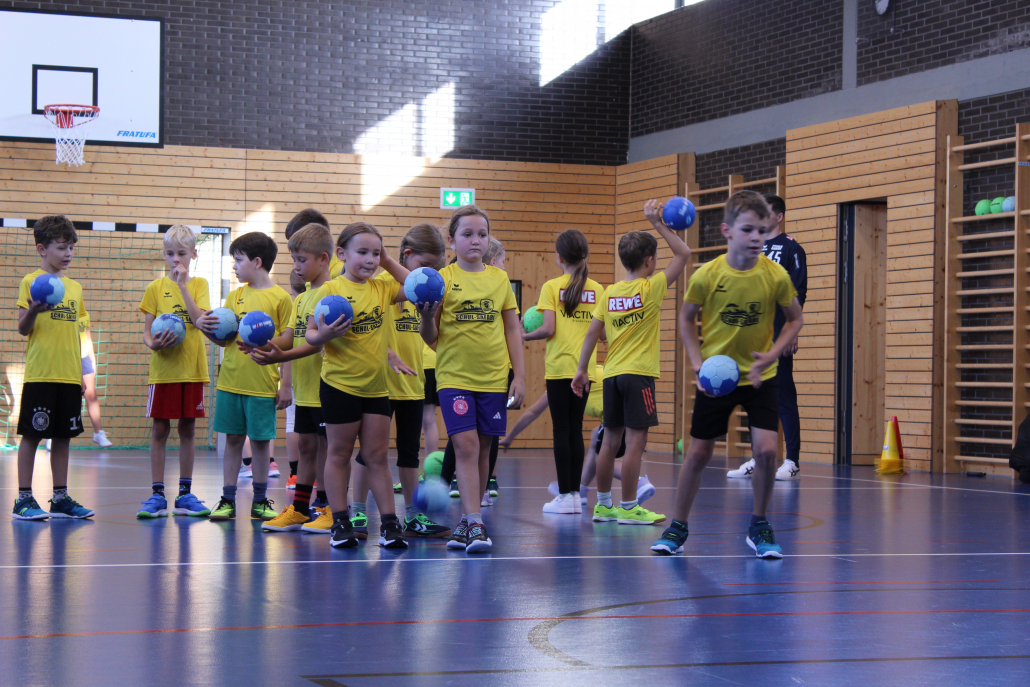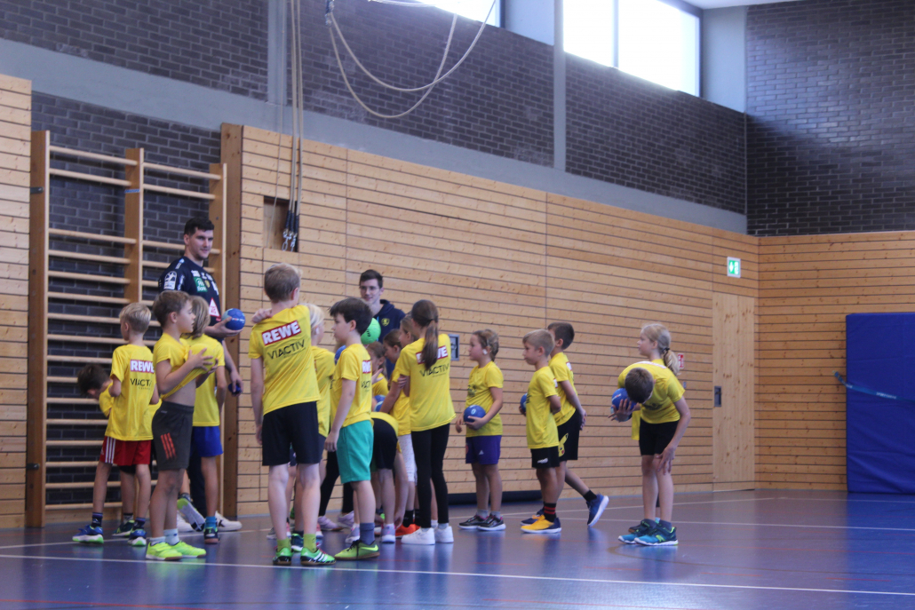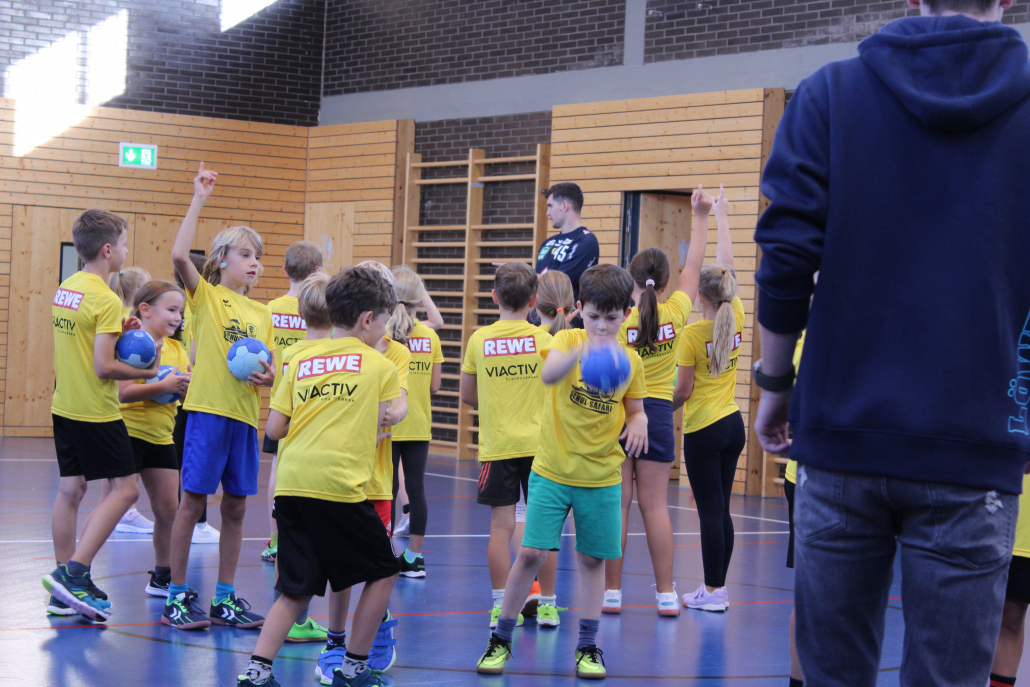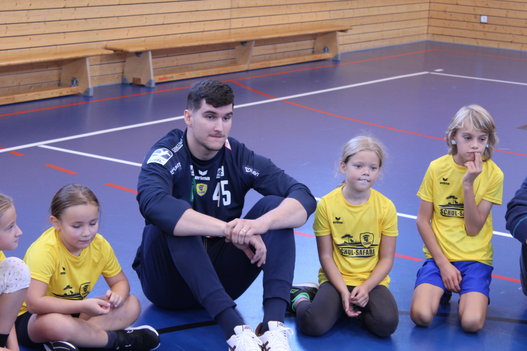 Im Rahmen der Schulsafari kamen die Kinder in den Genuss eines professionell angeleiteten Handballtrainings mit dem kroatischen Nationalspieler und Weltklasserückraumspieler Halil Jaganjac und Junior Marketing Manager Luca Altemeier.