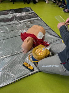 Viele Kinder hatten schon gute Kenntnisse, wie man sich im Notfall verhalten sollte. Außerdem war die Nummer 112 auch schon bekannt. Jetzt wurde allerdings noch besprochen, wie man sich verhält, wenn man einen bewusstlosen Menschen vorfindet. In Paaren übten die Mädchen und Jungen die stabile Seitenlage. Die Frage, was man tun kann, wenn man jemanden mit einem Herzstillstand vorfindet, konnte auch geklärt werden – natürlich: Herzmassage. Diese konnte allerdings nur an einer Puppe geübt werden. Auch, wie ein Defibrillator funktioniert wurde den Kindern vorgeführt.